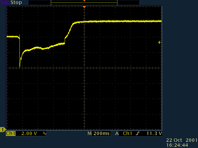 voltage at the battery drops down to 8 volts for a few milliseconds.